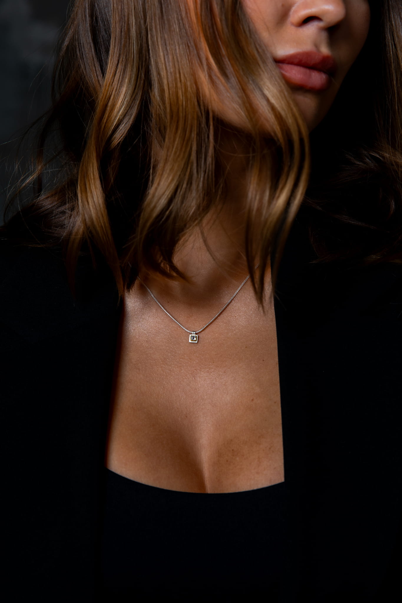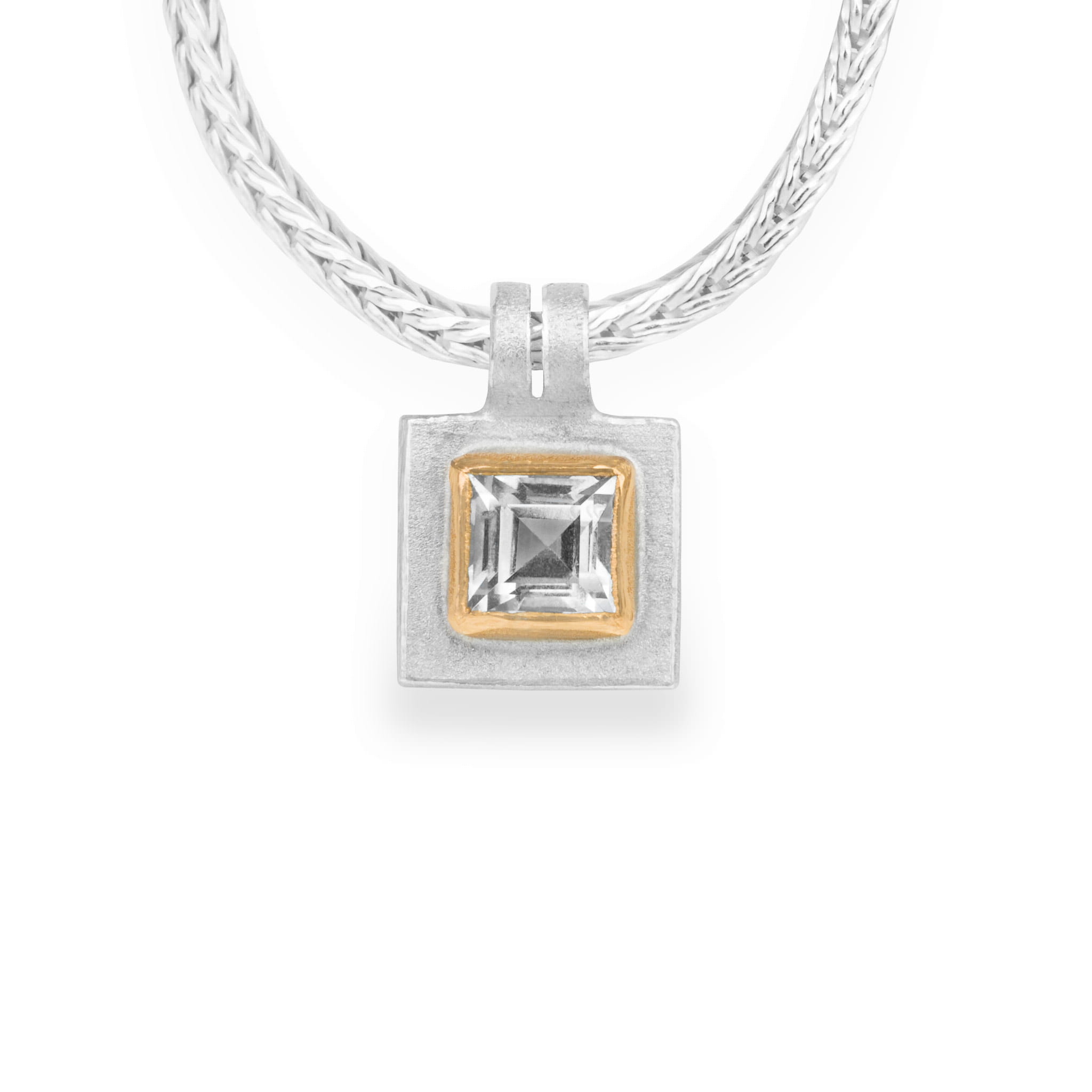 Naszyjnik Lapidea Nº3 jest wykonany ze srebra próby 925 oraz 24-karatowego żółtego złota, w które został starannie oprawiony lśniący kwadratowy błękitny topaz.